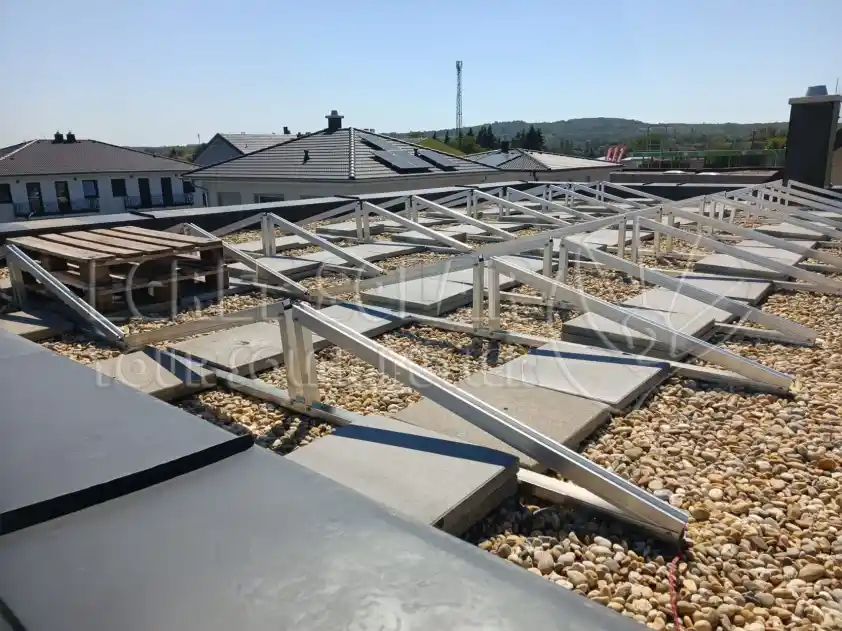Beton bloku balast qabına qoyun. Qeyd etmək lazımdır ki, əvvəlcədən yığılmış bir ştativ dəstəyi dörd beton blokla dəstəklənməlidir və hər bir beton blok ən azı 60 kq ağırlığında olmalıdır. Beton Düz Dam Balast Günəş Montaj Sistemində sement bloklarının ölçüləri və yerləşdirilməsi aşağıdakı şəkildə göstərilmişdir.